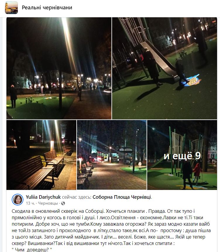Сходила в оновлений скверік на Соборці. Хочеться плакати . Правда. От так тупо і прямолінійно у когось в голові і душі. І лисо.Освітлення - єкономне. Лавки не ті.Ті таки потирили. Добре хоч, що не тумби.Кому заважала огорожа? Як зараз модно казати вайб не той.Із затишного і прохолодного в літку,стало таке,як всі.А по- простому : душа пішла з цього місця. Зато дитячий майданчик. І діти.... веселі. Боже, яке щастя.... Якій це тепер сквер? Вишиванки? Так і хочеться спитати :