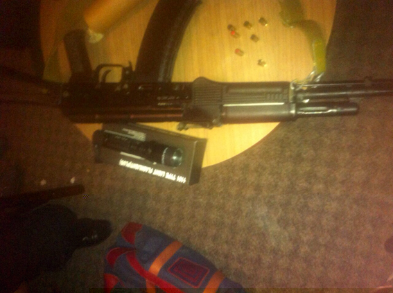 Знайшли правоохоронці у студента немало: автомат АКС-74, калібру 5.45 мм, димову шашку РДГ-Б, сім набоїв калібру 9 мм, ніж-стилет та 6 ножів для метання з довжиною леза 12 см, ніж з плетеною ручкою довжиною леза 14 см, 3 ножа для метання довжиною леза 8 см, сюрикени (зірки для метання), електрошокер і телескопічну дубинку з наконечником.