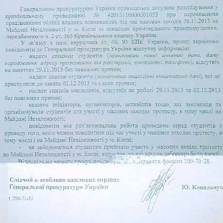 Окрім того, слідчий просить надати списки викладачів, які не виходили на роботу без поважних причин, імена активістів, які закликали студентів виходити на Майдан.