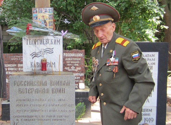 Эта фотография с того же мемориального кладбища на территории храма Всех Святых примечательна тем, что на ней изображён «любимый» московский ряженый «ветеран», он же, но уже без кавычек любимый сетевой ветеран, герой всех войн и фронтов, Лев Александрович Гицевич.