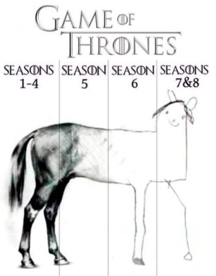 7 сезонів всі чекали приходу білих блукачів, всі чекали вічної зими і повного пи***ця, а тут раз - і нема загрози. Ну ок, кажуть, "гра престолів не про блукачів, а саме про гру за престоли", але і її не було до кінця серіалу)