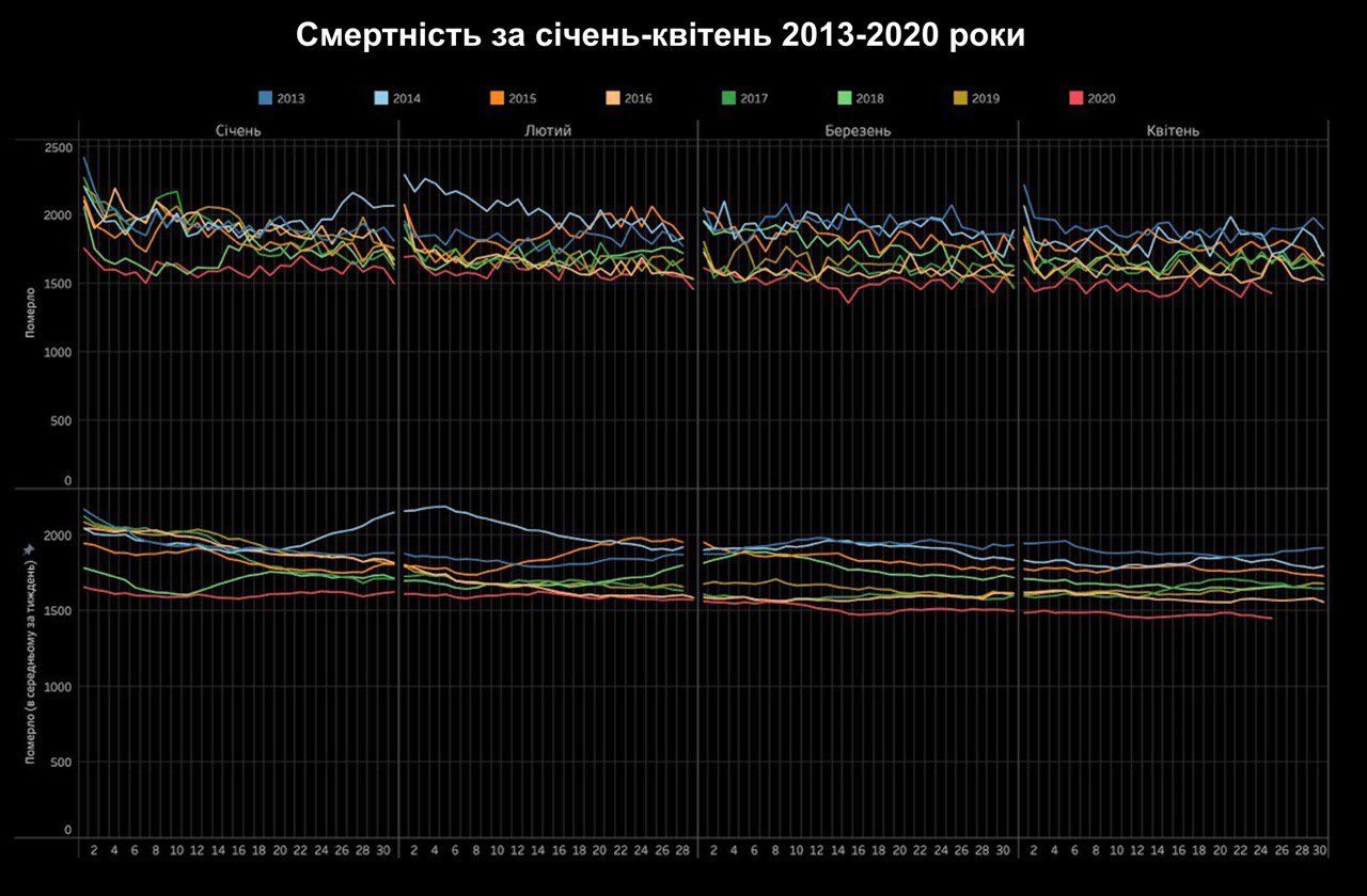 На этом графике вы видите данные по смертности за январь-апрель — сравнение 2013-2020 годов. Сверху — данные по дням, ниже — “сглаженные” для удобства, среднее за неделю.