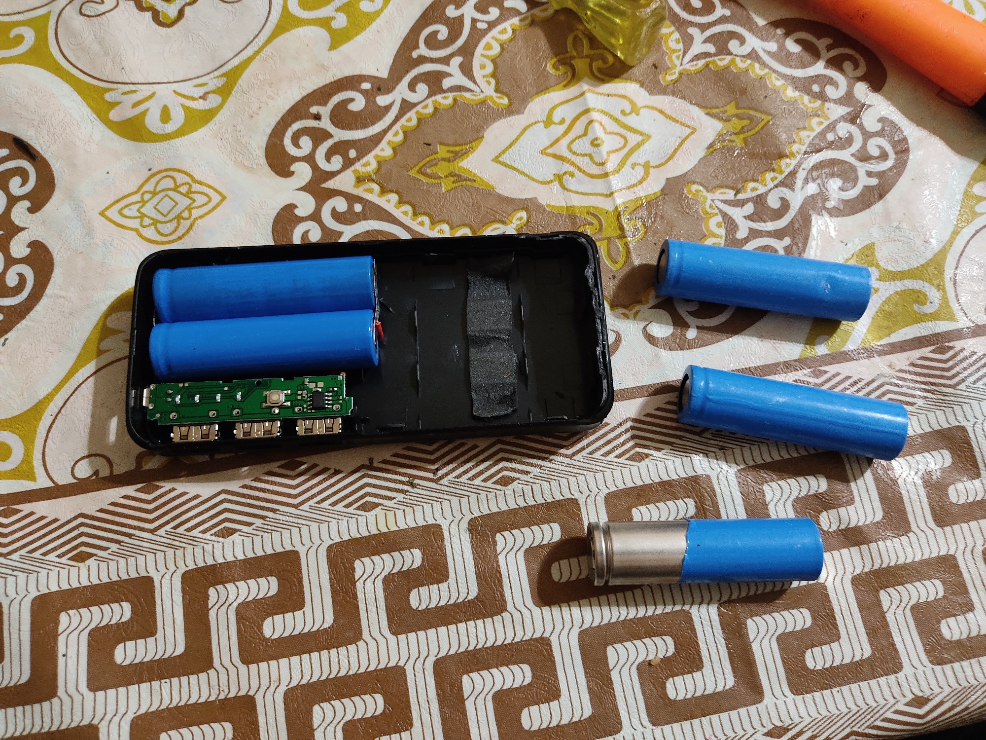 . Вскрыл. Внутри типо пять элементов 18650, но подключены только два, а три элемента просто лежат внутри. И показались мне эти три элемента какими то странноватыми. Они немного легче чем два подключенных, да и просто интересно мне стало что же у них внутри.
