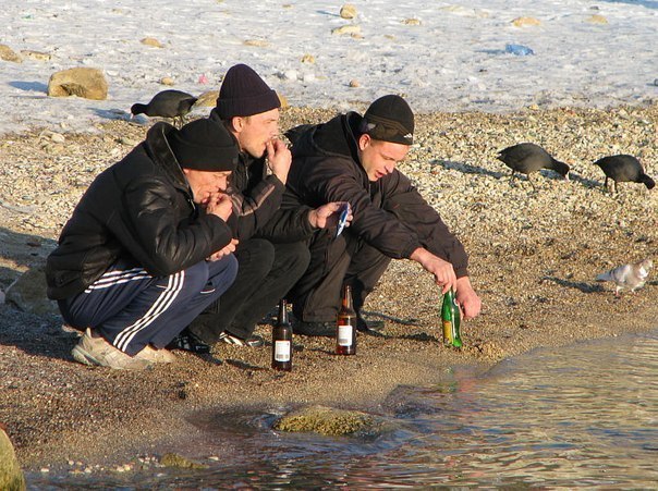 Мужики поехали компанией на микроавтобусе на природу и случайно разбили в салоне несколько бутылок вина. Пока убирали осколки, многие порезались.