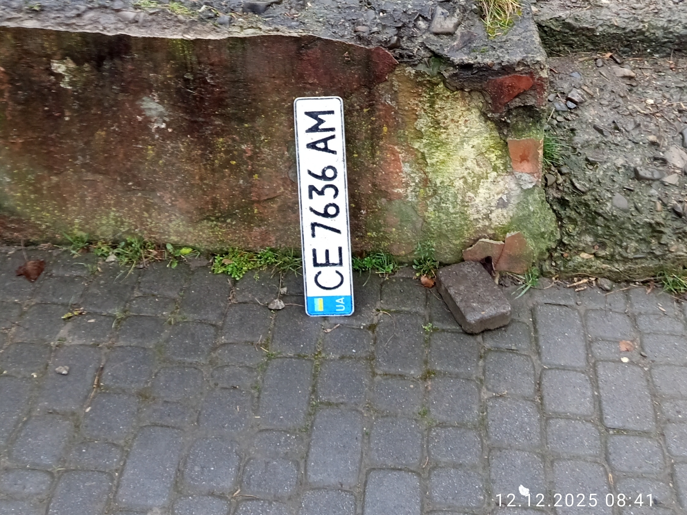 Доброго дня. Хтось загубив номерний знак у м. Чернівці - СЕ 7636 АМ (прикріпляю фото). Він знаходиться навпроти залізничного вокзалу - зліва від 3-поверхового будинку (вул. Вокзальна, 19).