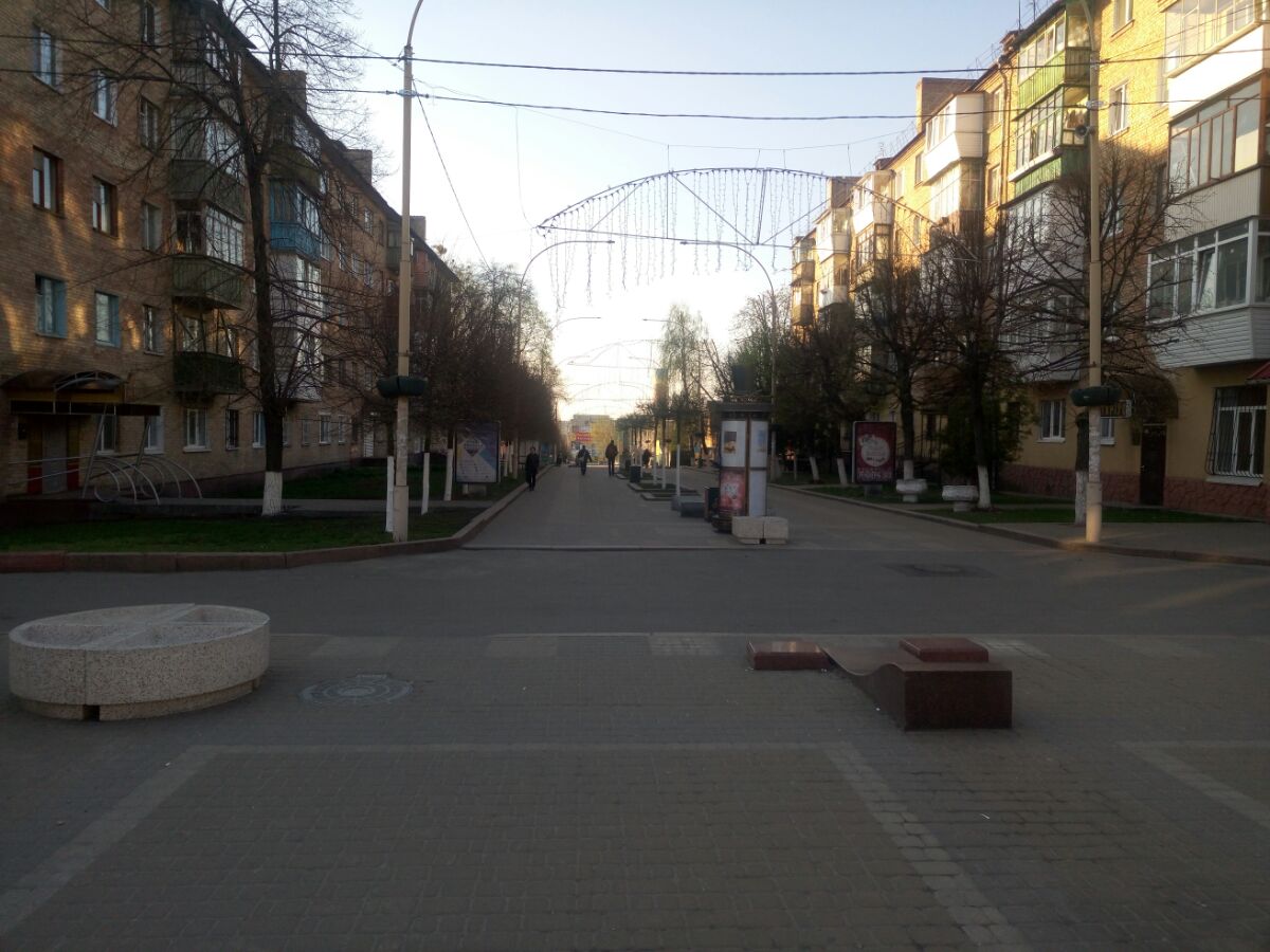 Вроде как центральная площадь. Заметно, что Буча - пгт, статус города в 2007 году, и все дико провинциально. Архитектурный ансамбль этой площади не будет участвовать в конкурсах. Но это не мешает плитке и дороге быть ровной. Все для людей, аккуратно и удобно. И её продолжают благоустраивать, высаживают деревья и т. п. Центр города, там где мерия, это такой район 2км длинной и 1км ширииной. Внутри несколько пешеходных улиц, например: Дома в этом районе 3-5 этажные, на вид 1960х- 1970х годов. Про территорию рядом с ними не забывают и так же благоустраивают.