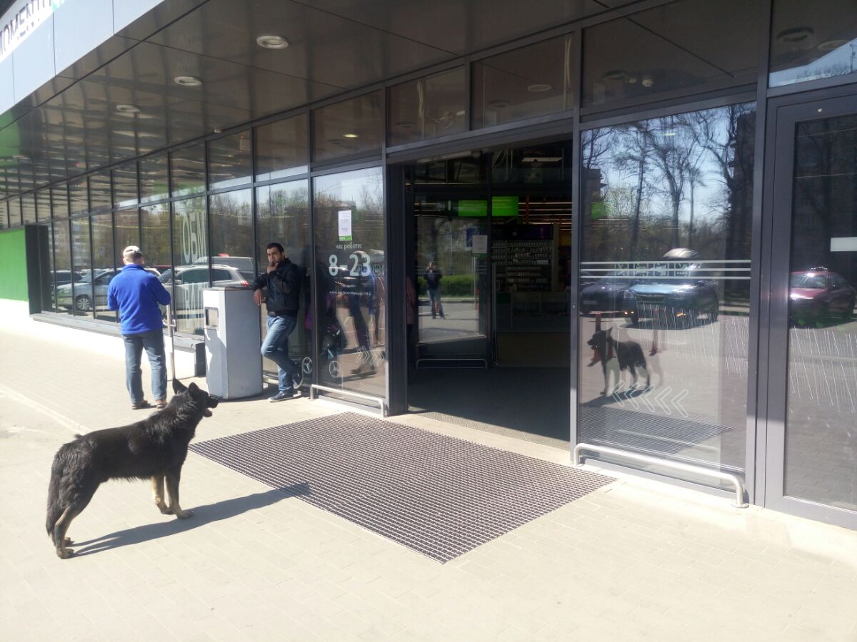Парковка в Буче: Места таки много, между рядами 2 машины проезжает без проблем: специальные заглушки, чтобы машины не наезжали на бордюр (хотя он и не времен Франца-Иосифа) После парковки мы заходим через двери. А затем обратно выходим из дверей с тележкой. Казалось бы, раздвигающиеся двери придуманы много лет назад, в 80% случаев люди выходят из магазина с тяжелой тележкой или сумками, и им неудобно открывать рукой дверь. Но нет, в Черновцах двери не раздвигающиеся. (Собака на фотке - одна из немногих попавшихся бездомных) Затем мы берем тележку и идем в зал, набирать продуктов. Если вы были в Сильпо в Черновцах, то наверняка помните ужасное состояние тележек. Колеса вечно клинит и тележку ведет в сторону.