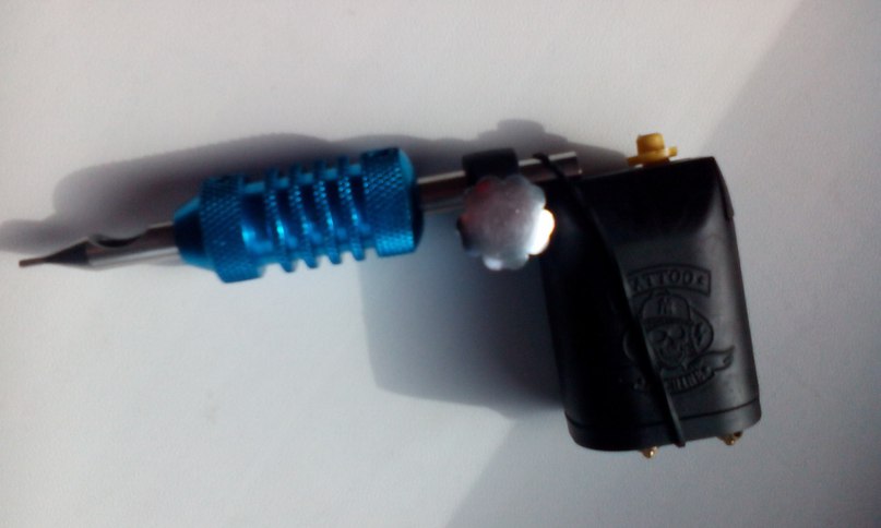 Надо заметить, что мои друзья видели мои пробы, мою заинтересованность и захотели дабы я им набила тату. Но иглой набивать - реально моторошно. Я обратилась к Сулейману и получила то чудо, что на фото внизу. Но так как мне нужна была возможность после каждого клиента менять иглу, вариант с гитарной струной отпал. Он мне предложил иголки для шитья бисером. Надо сказать, машинка шустрая, выносливая и точная. Но на тоненькую иголку можно набрать очень мало краски. Поэтому тату набить стало еще моторошнее.