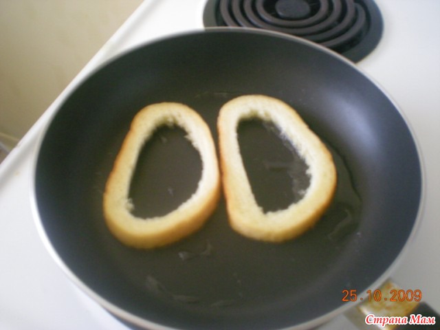 Есть также вариант приготовления - когда в начале обжаривается хлеб вымоченный как гренки, а уж потом только внутрь яйцо, - что вкусней - на ваше усмотрение.
