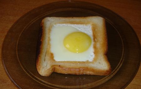 Есть также вариант приготовления - когда в начале обжаривается хлеб вымоченный как гренки, а уж потом только внутрь яйцо, - что вкусней - на ваше усмотрение.