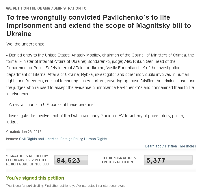 Так, хатні і не дуже хатні активісти, поки не маємо можливості і залізних яєць ламати стіни СІЗО і тюрем, можна поборотись і підписами. Думаю, хто такі Павличенки пояснювати не потрібно. Тому, Клацаємо "Create an account", робимо все необхідне, відтак - "sign this petititon". Є яка-не-яка надія на розголос цієї справи у Вашингтоні. У випадку, коли ця петиція набере більше 100 000 підписів до 25 лютого, будуть заморожені активи і розслідувана діяльність компанії "Гуйорд", також до "Списку Магнітського" (заборона вїзду до США і замороження рахунків) будуть внесені Могильов, Бондаренко, Рибка, Фаринник, Крюкін і інші, безпосередньо причетні до цього беззаконня.
