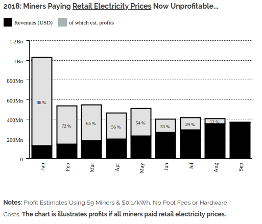 Хоть цифры на первый взгляд и кажутся большими, майнерам при этом огромные деньги нужно тратить на оплату электроэнергии по розничным ценам. Аналитики говорят, что именно эти траты стали причиной того, что в сентября майнеры впервые «ушли в минус» за последние несколько лет.