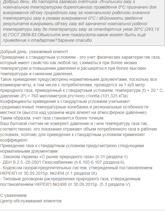 "Добрий день, шановний клієнт! Нарахування коефіцієнтів приведення об'ємів газу до стандартних умов для побутових споживачів газу регламентується Наказом Міністерства палива та енергетики №595. Більш детально Ви можете ознайомитися з Наказом за посиланням: https://zakon.rada.gov.ua/laws/show/z1224-03.З повагоюЦентр обслуговування клієнтів"