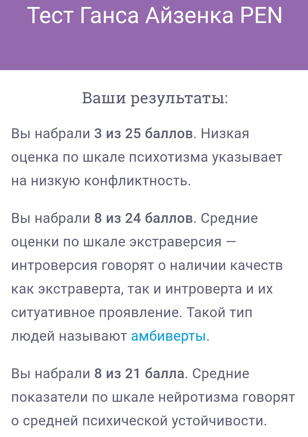 Я——экстраверт со средней конфликтностью и высоким порогом психологической устойчивости.Інна) писав: ↑16 березня 2019, 12:38Вот ещё один интересненький)