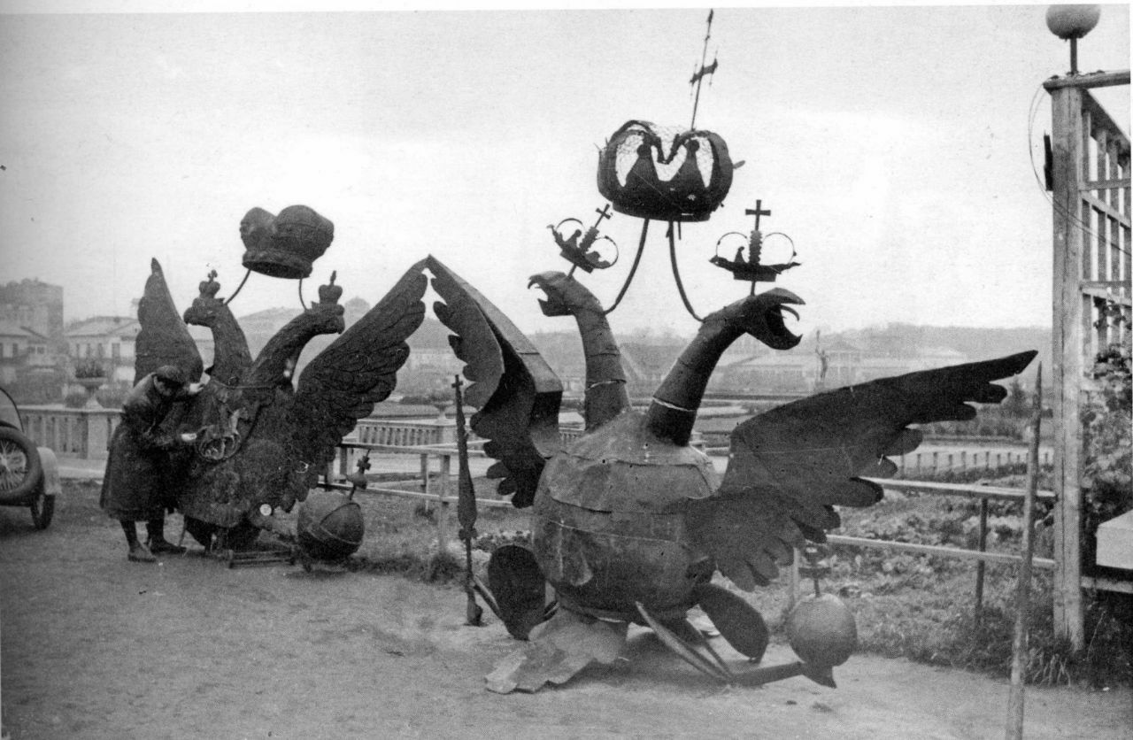 Снятые с Кремля орлы выставлены в парке им. Горького для обозрения. Москва, СССР, 1935 год.