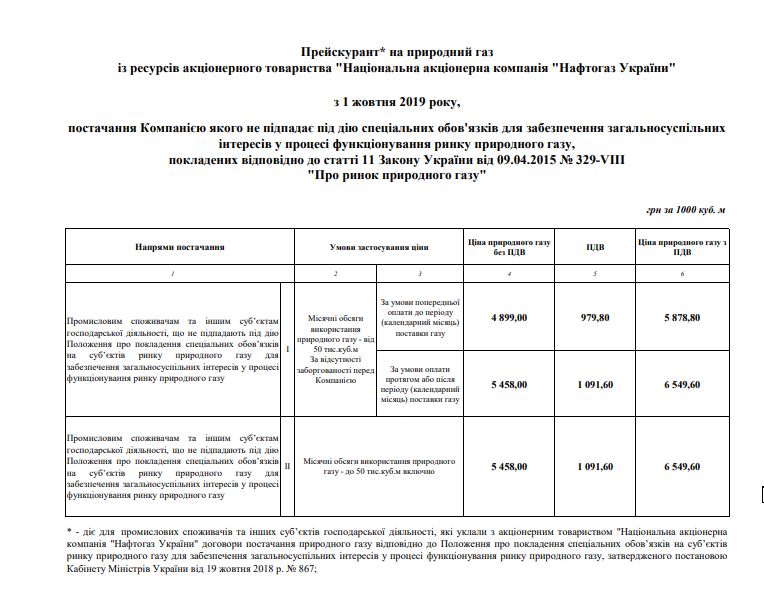 * Застосовується лише при сукупності трьох умов: 1) споживачі використовують газ для опалення; 2) у період з 1 жовтня по 30 квітня; 3) для обсягу до 200 куб. м газу на місяць. Приклад застосування ціни дивіться тут.