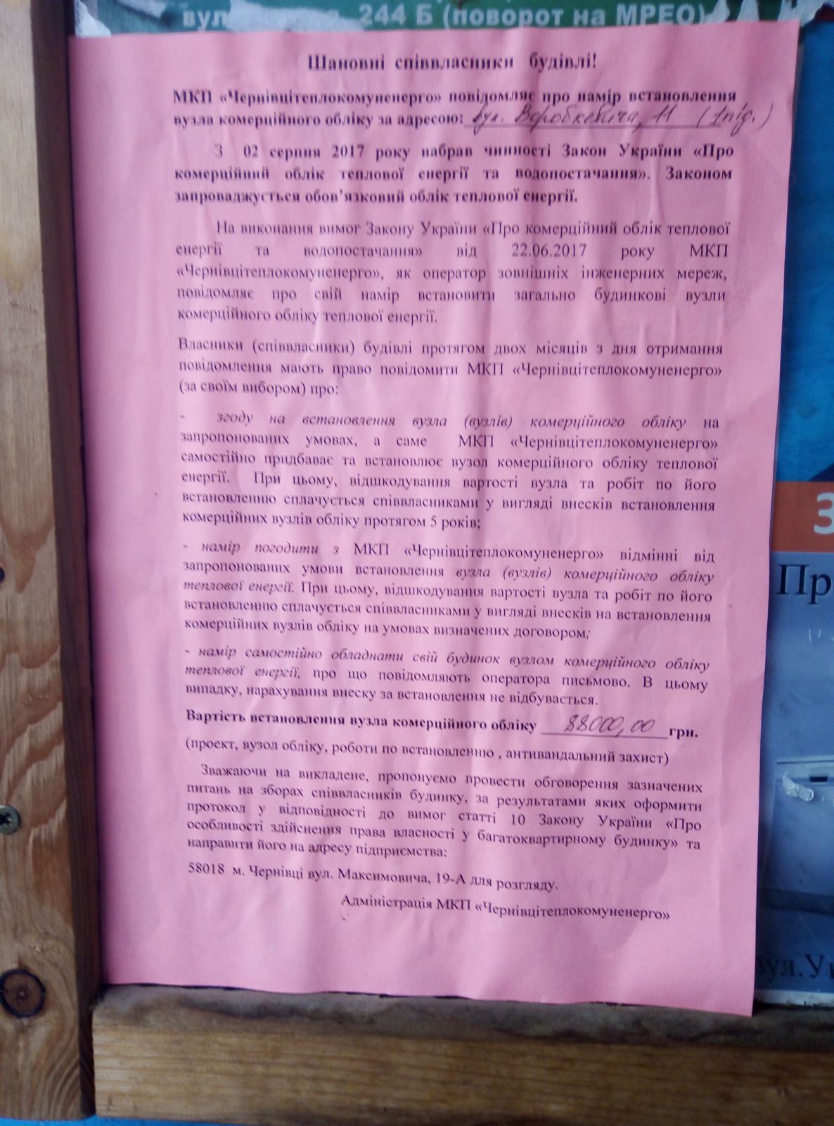 МКП "Чернівцітеплокомуненерго", як оператор зовнішніх інженерних мереж, повідомив про свій намір встановити загальнобудинкові вузли комерційного обліку теплової енергії.