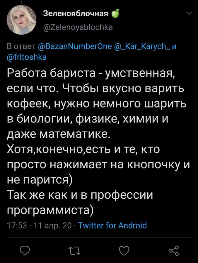 Вроде месседж в том, что труд программиста более интеллектуален чем баристы? Так это от человека и подхода зависит, не от профессии. Даже хз, зачем я объясняю столь очевидные вещи?)