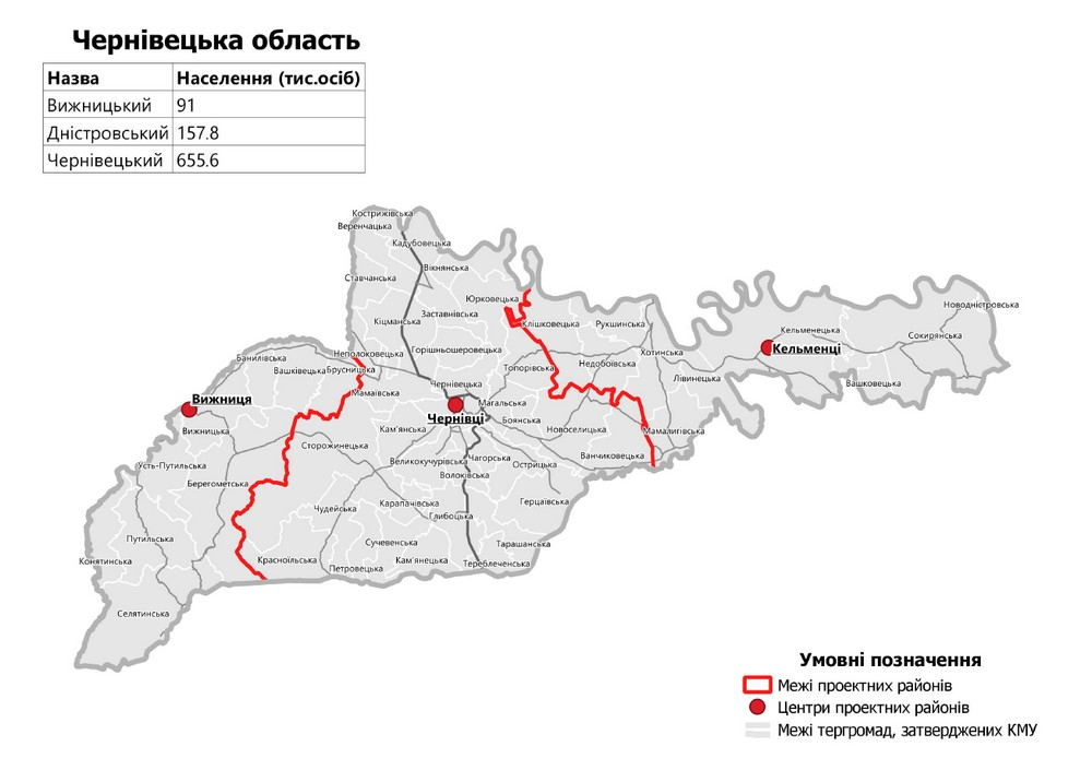 У Чернівецький район (655 тис. населення) увійдуть місто Чернівці, яке стане центром району, Кіцманський, Сторожинецький, Глибоцький, Заставнівський та Герцаївський райони.