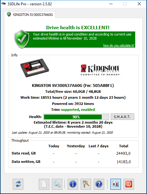 вот - выкладываю что и обещал , как видно диск после 6,5 лет еще бодренький и может прожить еще 8 лет , все время на нем была система и свободным было около 10 г из 60.