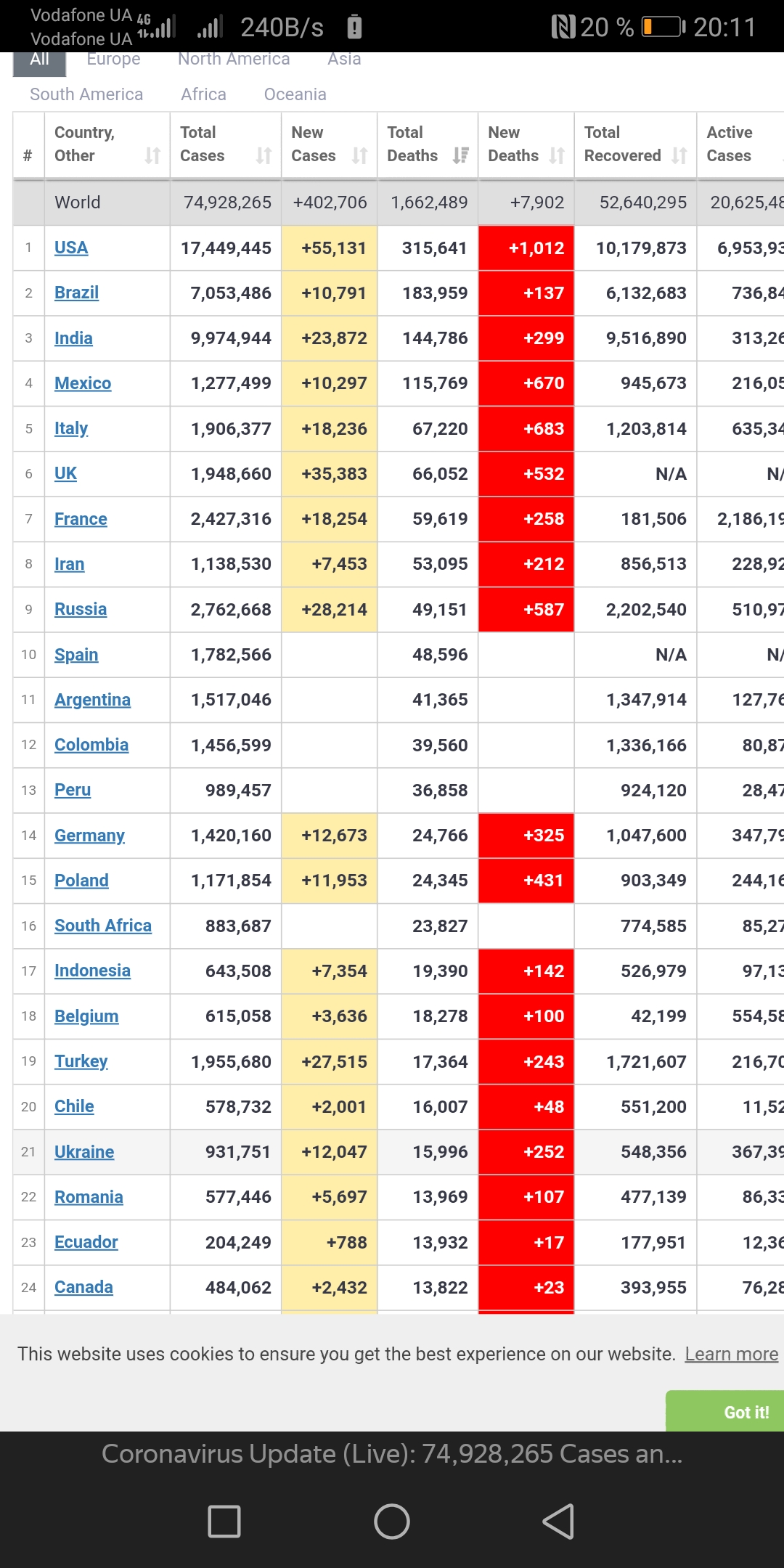 Україна опинилася на 15 позиції за станом на 16 грудня (17 на сьогодні) за кількістю підтверджених хворих і на 11 - за кількістю летальних випадків.