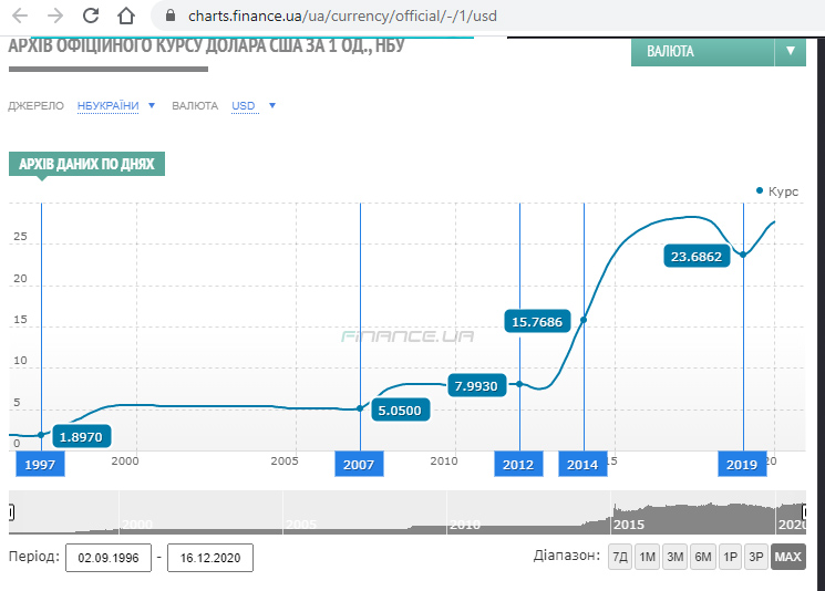 Сделал анализ курса доллара за последние 24 года на сайте https://charts.finance.ua/ua/currency/official/-/1/usd