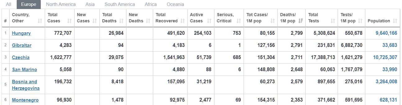что рассказать жителям Чехии и Венгрии про эффективность лохдаунов и масок если у них смертность в 2 раза выше чем в Швеции где всего этого не было??