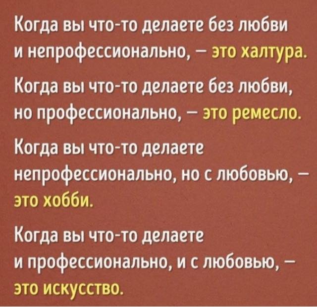 Есть такое мнение, что работа ( в идеале) должна быть твоим хобби, которое приносит пользу и тебе и окружающим.