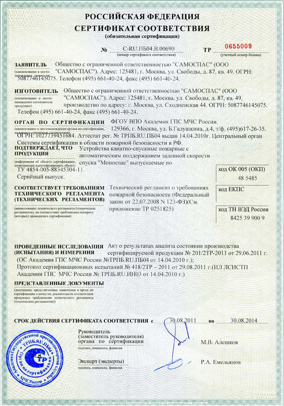 Специалистами института была изучена нормативная документация на данный вид устройств, а также их технические характеристики за результатами чего была разработана программа и методика проведений испытаний. На сегодня она находиться на стадии утверждения и уже в ближайшее время за этой методикой будут проведены сертификационные испытания на пожарно-испытательном полигоне института