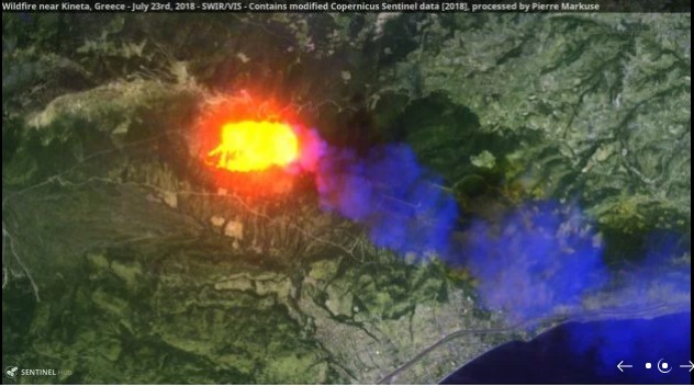 Пожары в курортной Греции достигли таких масштабов, что их хорошо видно из космоса. Интересные снимки удалось сделать европейскому спутнику Sentinel 2 из программы «Коперник», сообщает Европейская правда.