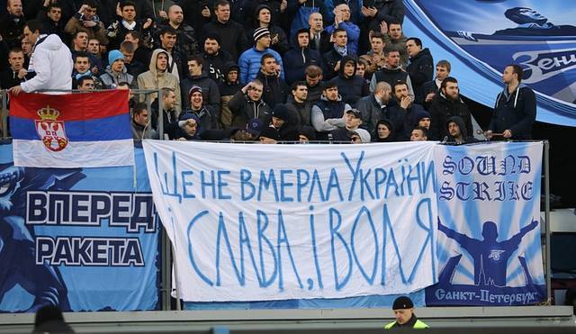 24.03.2014. на матче "Зенит" - "Крылья Советов" болельщики питерского клуба развернули баннер в поддержку Украины.