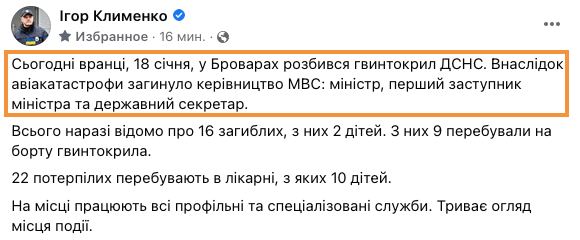 "Сьогодні вранці, 18 січня, у Броварах розбився гвинтокрил ДСНС. Внаслідок авіакатастрофи загинуло керівництво МВС: міністр, перший заступник міністра та державний секретар. Всього наразі відомо про 16 загиблих, з них 2 дітей. З них 9 перебували на борту гвинтокрила", – заявив він.