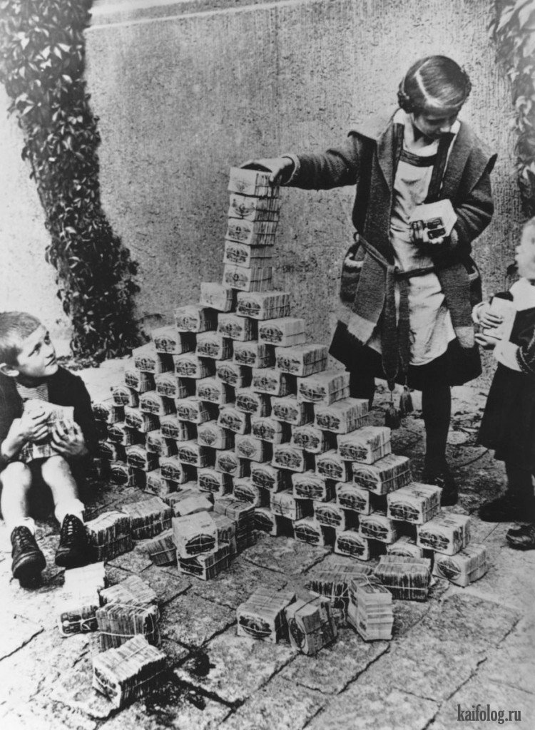Гиперинфляция в Германии в 1923 году. Инфляция достигла того, что конце ноября доллар стоил уже 4,2 триллиона марок. Каждый месяц выпускались новые купюры более крупного номинала и к концу года появилась банкнота 100 триллионов марок, что составляло меньше 25-и баксов. Стало дешевле дать детям играть с пачками денег, чем покупать им кубики.