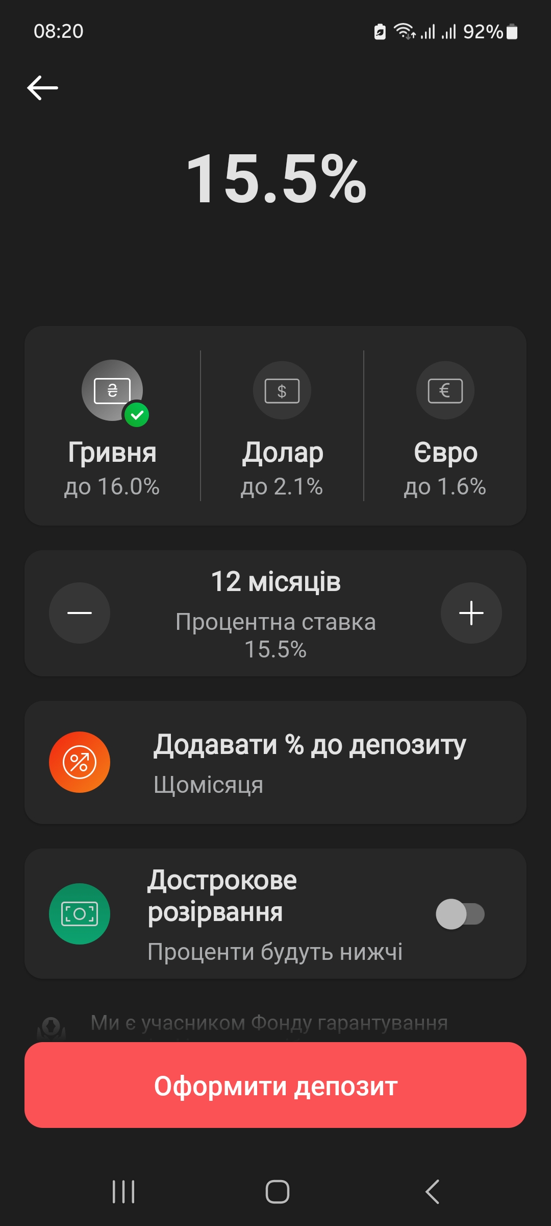 ну я і мої колеги цим користуються вже давно. Я особисто на цілий рік не сталю, я по пів року. Якщо ставити по 6 місяців, то виходить не 18, а 16%. Тобто за пів року капає 8%, а потім ставиш ще на пів року і ще 8%. Як на мене, так більш надійно, бо хоч процент і менший, але кожних пів року фіксуєш заробіток і він не згорає. Тобто якщо раптом хочеш вивести гроші, через 7-8 місяців, то все ж вже отримаєш прибуток за 6 місяців, а згорить просто за 2 місяця. Але якщо ставити на депозит і точно знати шо не прийдеться знімати гроші, то можна і зразу на рік.Дід Панас писав: ↑18 грудня 2024, 20:2118% річних - ?!!...в штатах більше 5 не дають. Далеко не кожен бізнес приносить такий відсоток в рік. Я готовий вкласти весь свій кеш, чи частину, якщо є 100% гарантії що вони протримаються ще рік і повернуть вкладені гроші з відсотками. ...і ще чомусь він заборонений в США, .