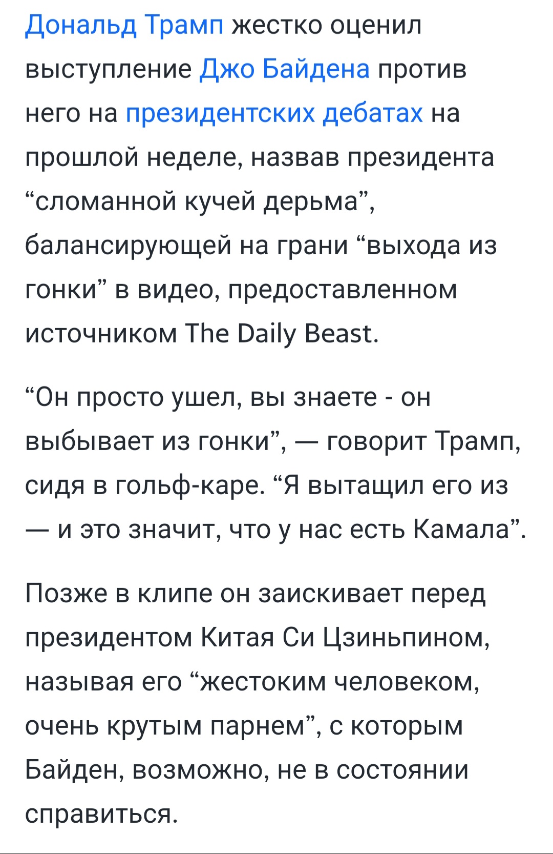 В оригіналі звучало приблизно так - Ви можете уявити, щоб цей хлопець (Байден) мав справу з Путіним? І президентом Китаю, який є жорстокою людиною. Він жорстока людина, дуже жорсткий хлопець...