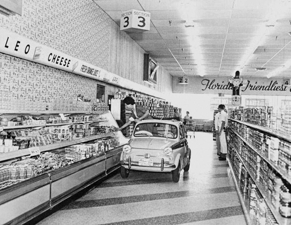 В супермаркетах Publix раньше возили покупателей на миниатюрной машине, 1957 год.
