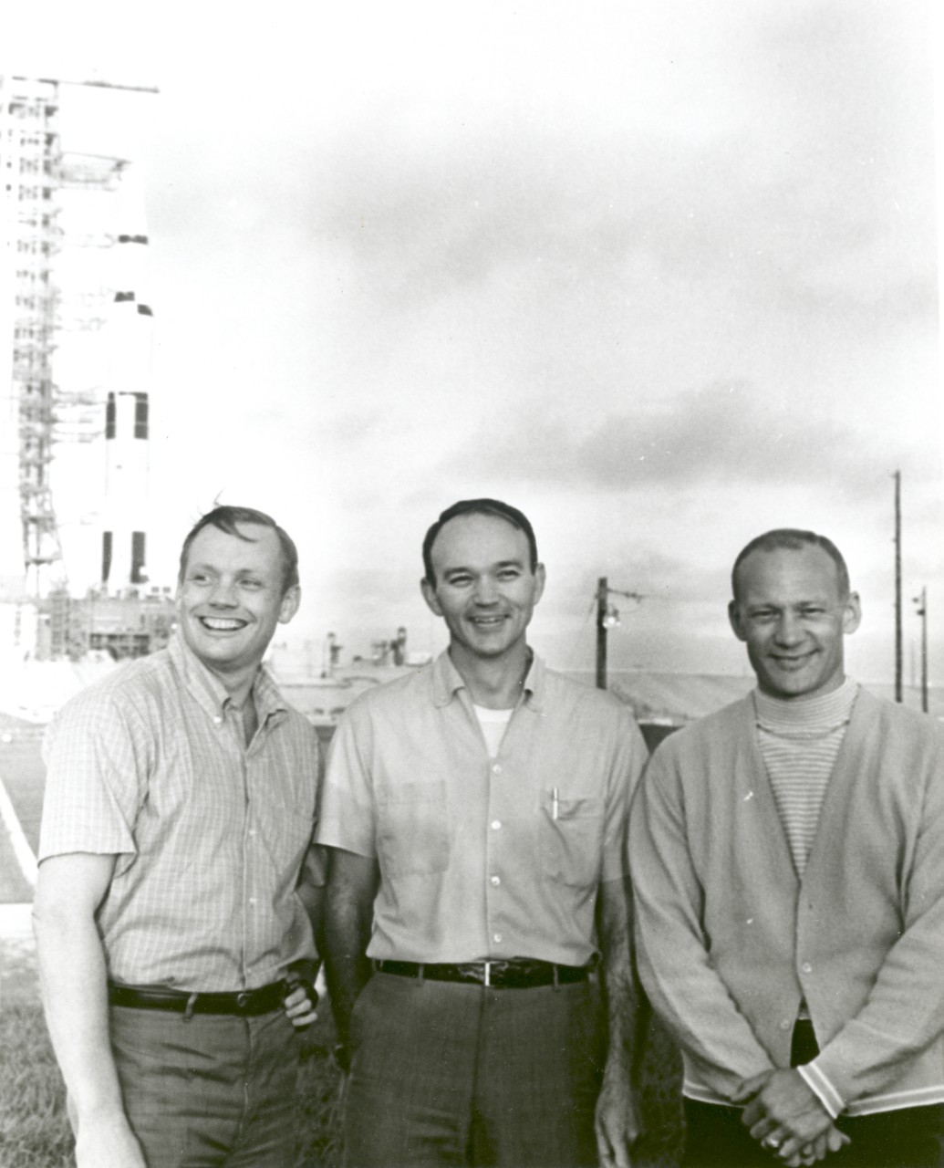 Экипаж миссии «Аполлон–11»: Нил Армстронг, Майкл Коллинз и Эдвин Олдрин во Флориде на фоне своего космического корабля. США, 20 мая 1969 года.