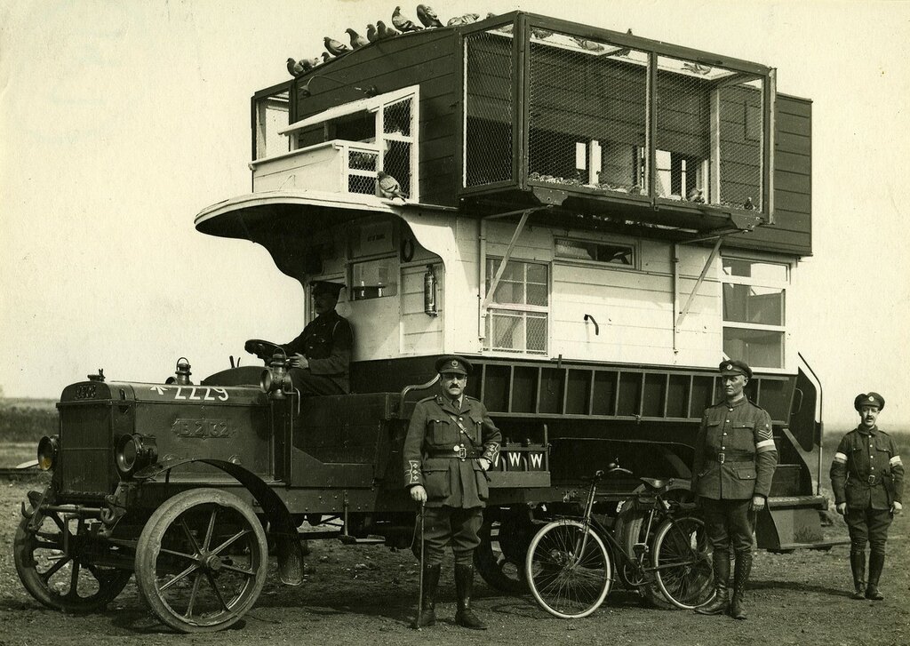 Лондонский автобус типа «B», переоборудованный в голубятню, применялся британцами в северной Франции и Бельгии в Первую мировую войну, 1916 год.