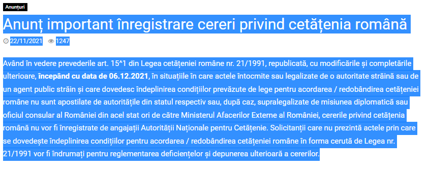 Важливо! Починаючи з 06.12.2021 подання документів на румунське громадянство лише з апостилем. Якщо раніше так само була ця вимога, але багато хто подавалися без апостилю, його потім доносили, то з 6 грудня 2021 року документи без апостилю прийматися не будуть, а будуть відразу ж віддані заявнику на доопрацювання. Вся детальна інформація за посиланням: http://cetatenie.just.ro/anunt-importan ... ia-romana/