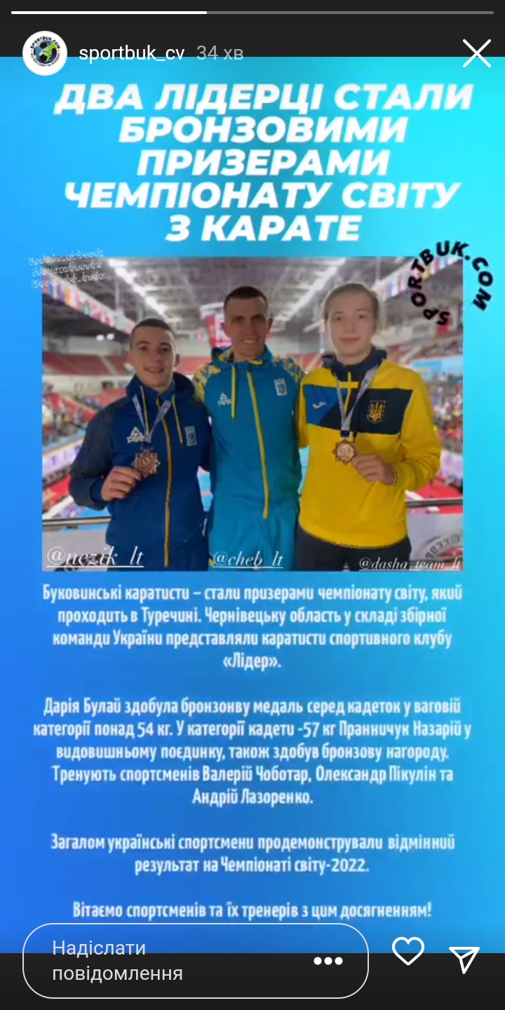 Re: Суддя з Ірану позбавив буковинку перемоги на чемпіонаті світу з каратеяк така несправедливість взагалі можлива...Jillian писав: ↑27 жовтня 2022, 19:40Раз вже поміняли на тему для обговорення, то коротка історія. Даша Булай вихованка нашого спортивного клубу "Лідер". Дійсно дуже сильна і талановита спортсменка. Для моєї доньки вона є прикладом і куміром, саме тому вона так переживає за неї. Неодноразово були з нею на різних тренуваннях. З Дашею ми познайомились ще три роки назад коли і не було у неї великих "регалій". На наших очах вона здобула перше звання чемпіонки України. Потім кілька відборів і чемпіонат Європи у Фінляндії. Там на четвертому поєдинку вона з москалькою вийшла на 0:0. Результатами голосування перемогу присудили москальці. Образливо але це спірне питання, тому проковтнули образу. Згодом Даша завойовує другий чемпіонат України, відбори і чемпіонат Європи в Хорватії. Місяць чи два назад отримала ліцензію на чемпіонат світу. І ось результат. При перемозі 1:0 іранський суддя за підтримки іншого москальского судді міжнародної федерації карате просто без підстав аннулює останню перемогу і дискваліфікує нашу спортсменку. Ще залишається шанс боротись за бронзу, але звання чемпіонки світу їй це вже не принесе.