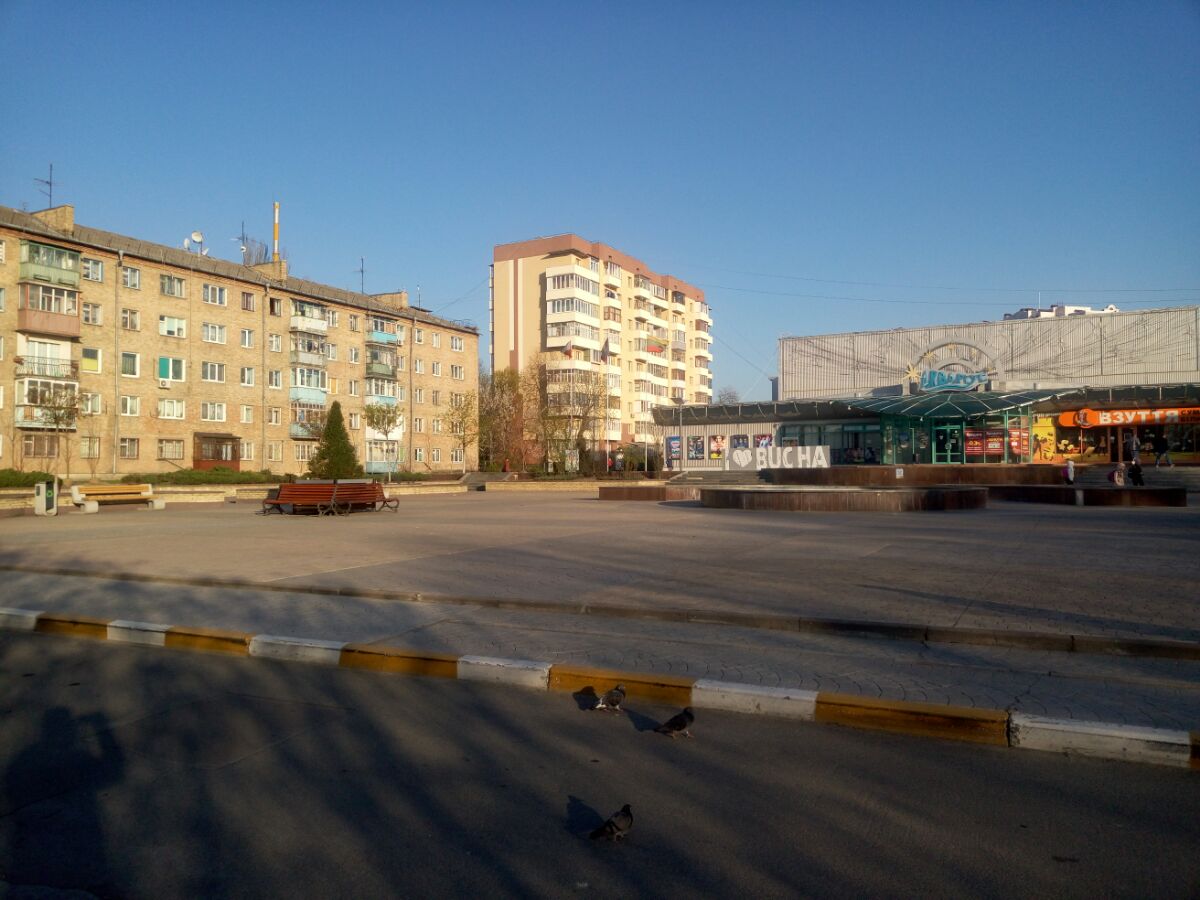 Вроде как центральная площадь. Заметно, что Буча - пгт, статус города в 2007 году, и все дико провинциально. Архитектурный ансамбль этой площади не будет участвовать в конкурсах. Но это не мешает плитке и дороге быть ровной. Все для людей, аккуратно и удобно. И её продолжают благоустраивать, высаживают деревья и т. п. Центр города, там где мерия, это такой район 2км длинной и 1км ширииной. Внутри несколько пешеходных улиц, например: Дома в этом районе 3-5 этажные, на вид 1960х- 1970х годов. Про территорию рядом с ними не забывают и так же благоустраивают.