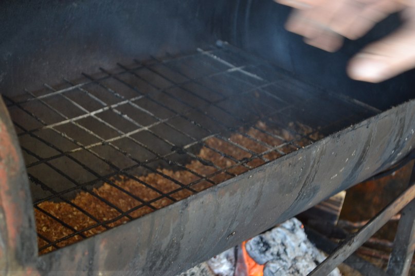Копчу на решетке,никакой фольги!для дыма в основном использую вишневые веточки,можно бук,осина!