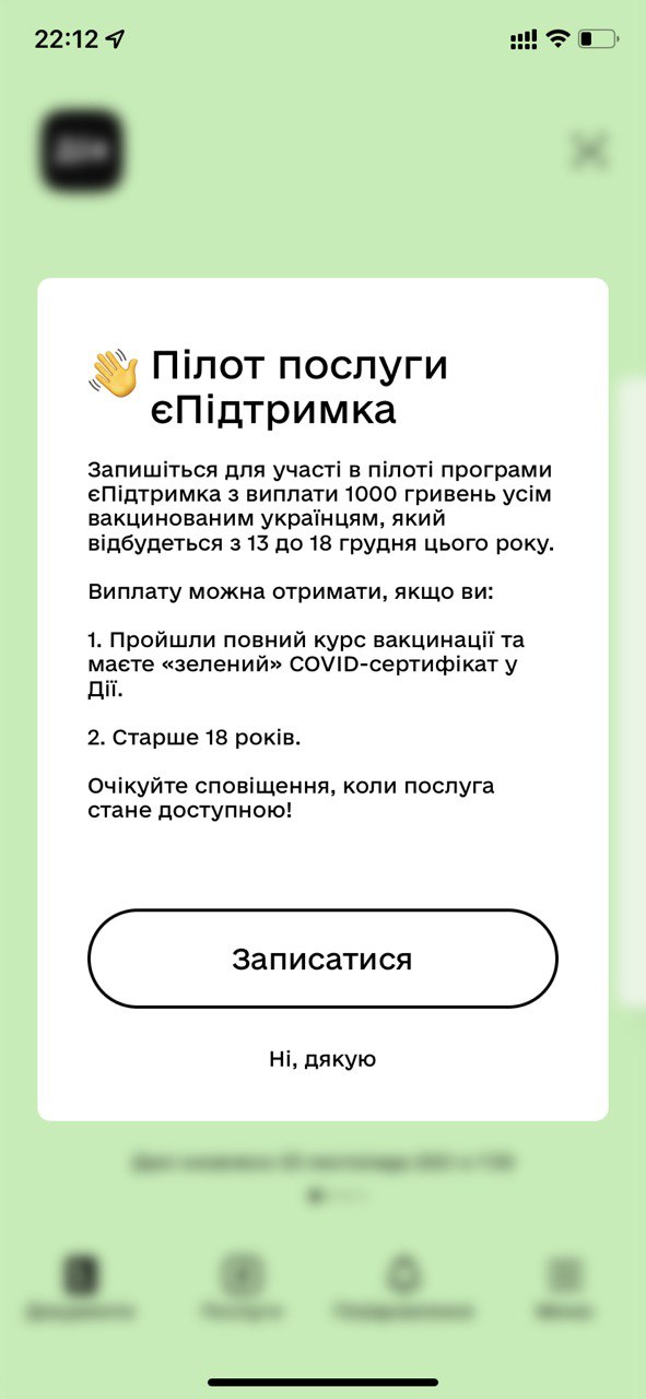 Сьогодні Уряд ухвалив Постанову щодо виплат 1000 грн від держави — проєкт єПідтримка. Це ініціатива Президента Володимир Зеленський, а технічну частину реалізує команда Міністерство цифрової трансформації України. На першому етапі виплата буде доступна з 19 грудня лише в застосунку Дія.