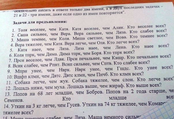 Та нормальні задачі на логіку, нам таких не задавали правда, але я задачі на логіку люблю. Там є всього пара складних і то тільки тому, що умова іде не словами, а набором букв (які є словом з пропущеними літерами).