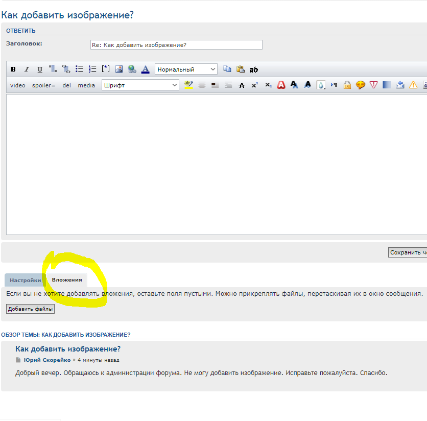 У меня вот например эпизодически отваливается копка Вложения > Добавить файлыdvs писав: ↑28 листопада 2018, 21:08уточните, какая именно проблема возникает при загрузке фотоЮрий Скорейко писав: ↑28 листопада 2018, 17:50Добрый вечер. Обращаюсь к администрации форума. Не могу добавить изображение. Исправьте пожалуйста. Спасибо.