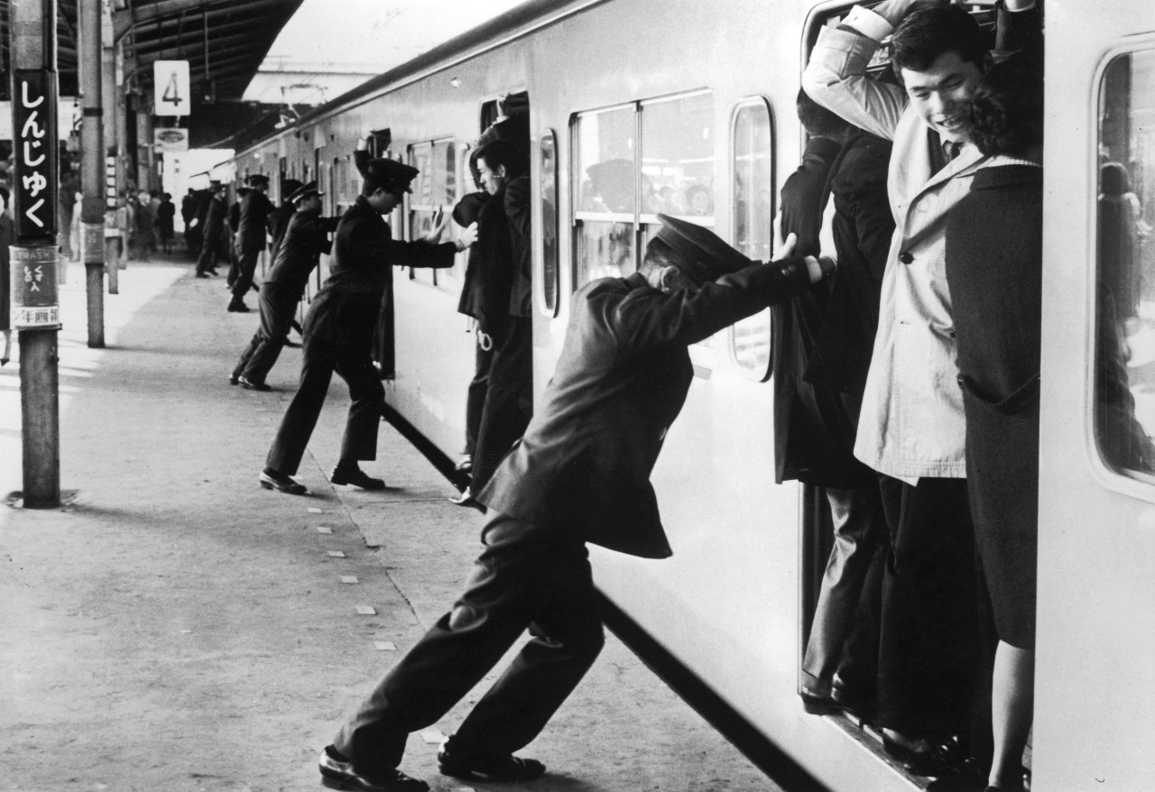 Толкачи, на токийской станции метро Синдзюку, пытающиеся вместить как можно больше пассажиров в вагоны в час пик. Япония, 1967 год.