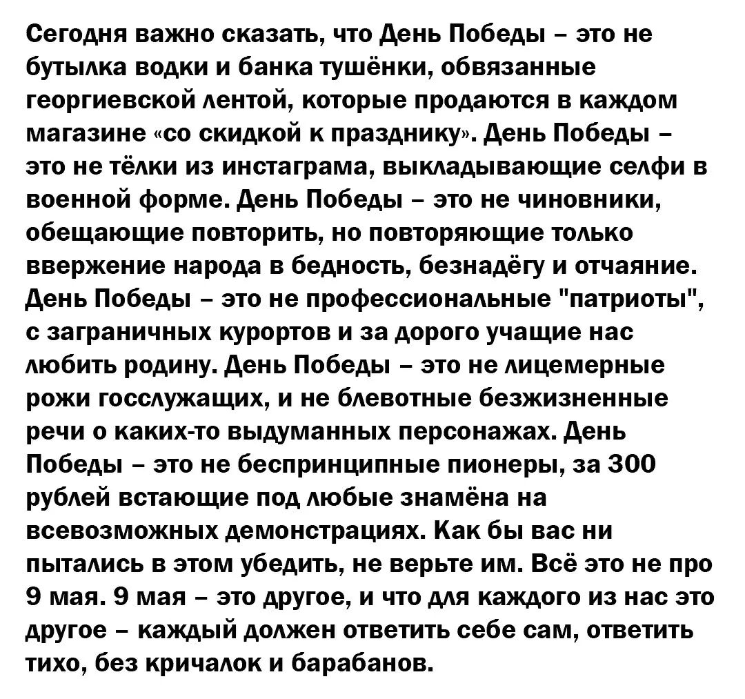 Я бы наверное все—таки больше склонялся к фразе ——shutzpavel450 писав: ↑09 травня 2020, 21:32Главная трагедия заключается в том, что ватаны тему второй мировой романтизировали, превратили черное в белое и пляшут с криками "Можем повторить"... При том, это люди, которые вообще никаим боком не имеют отношение к победе... Печально наблюдать за этим мракобесием...