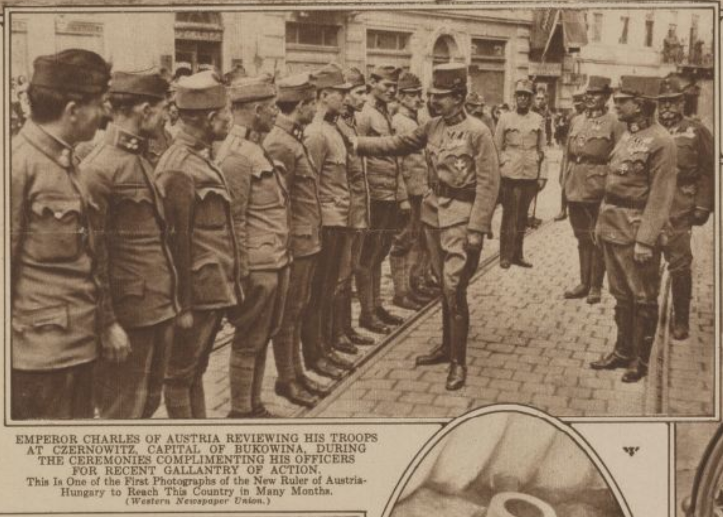 Останній правитель династії Габсбургів, Імператор Австро - Угорщини Карл І, на огляді військових в місті Czernowitz, столиці Буковини.
