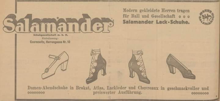 Реклама взуттєвого магазину Саламандра у Чернівцях. 1914 рік.