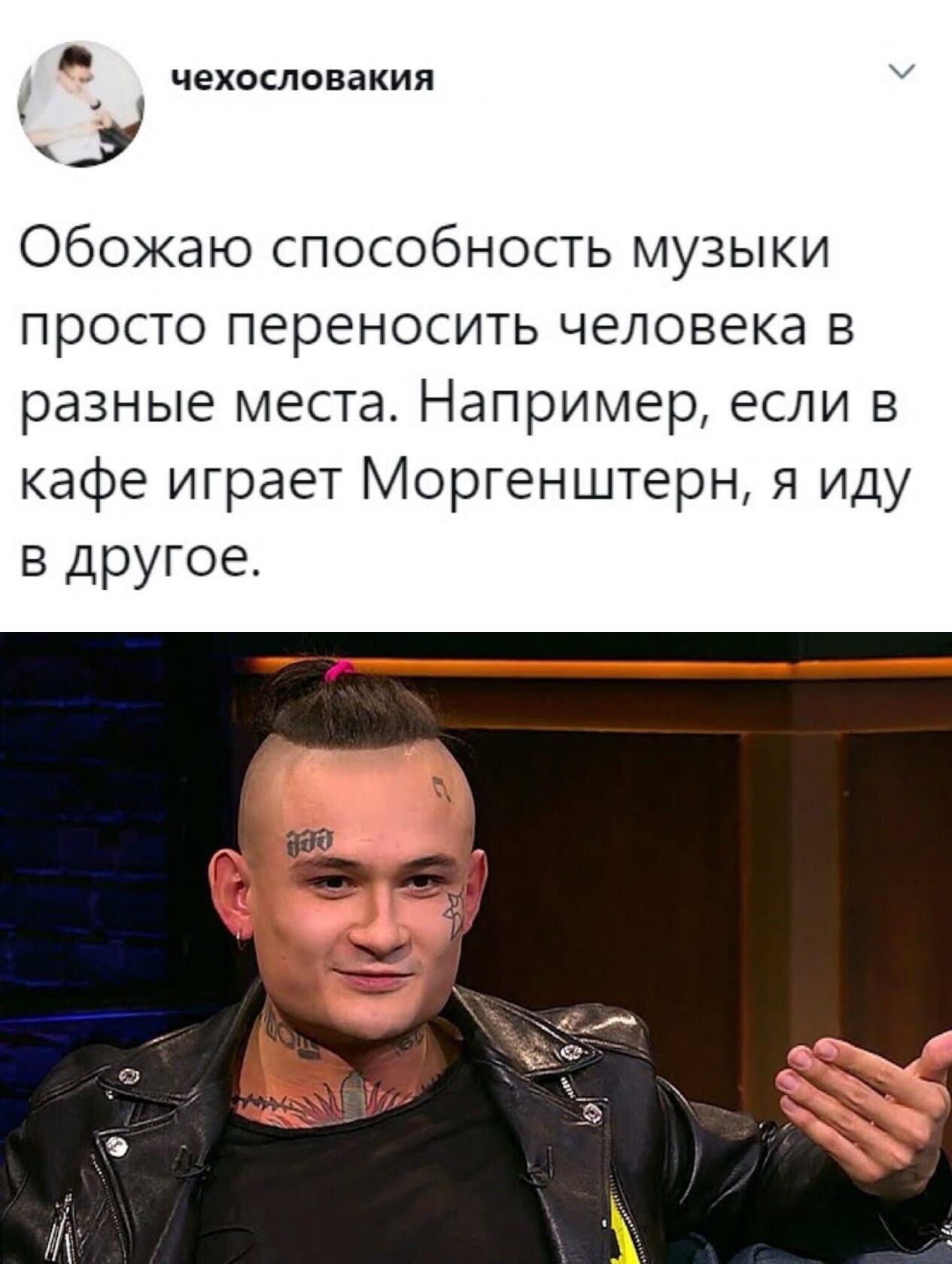 Вот опять, благодаря тебе, попытался глянуть пару клипов человека года. Если он стебётся, то достаточно зачетно, но всё равно дольше одной минуты клип смотреть( да и песню слушать) у меня не получается, не говоря уже о повторном просмотре. Ну, думаю, возраст, то да сё, спросил дочку. Её резюме было гораздо лаконичнее моих излияний - слушать пробовала, не нравится, музыка для дегратантов. Я с ней согласен.sergej1974007 писав: ↑13 листопада 2020, 22:42А тем временем Моргенштерн—— от которого Зеппелин услышав его переходит в другое кафе))——